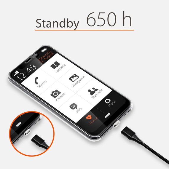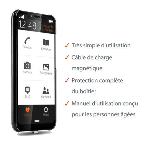 En tant que premier smartphone de la série Gigaset life, le GS195LS propose une utilisation particulièrement facile pour les seniors. L'adaptateur magnétique qui équipe le câble USB-C fourni facilite le branchement du smartphone - on pourrait presque le mettre en charge les yeux fermés ! Équipé d'une batterie longue durée, le GS195LS garantit jusqu'à 19 heures de conversation. Une protection d'écran et une coque arrière pré-installées vous permettront de conserver votre smartphone dans un état parfait dès le premier jour d'utilisation. Vous avez également la possibilité de personnaliser votre GS195LS en faisant réaliser une gravure personnalisée du dos de l'appareil.* Vous trouverez également des réponses détaillées et illustrées à toutes les questions concernant votre Gigaset GS195LS dans le manuel fourni.